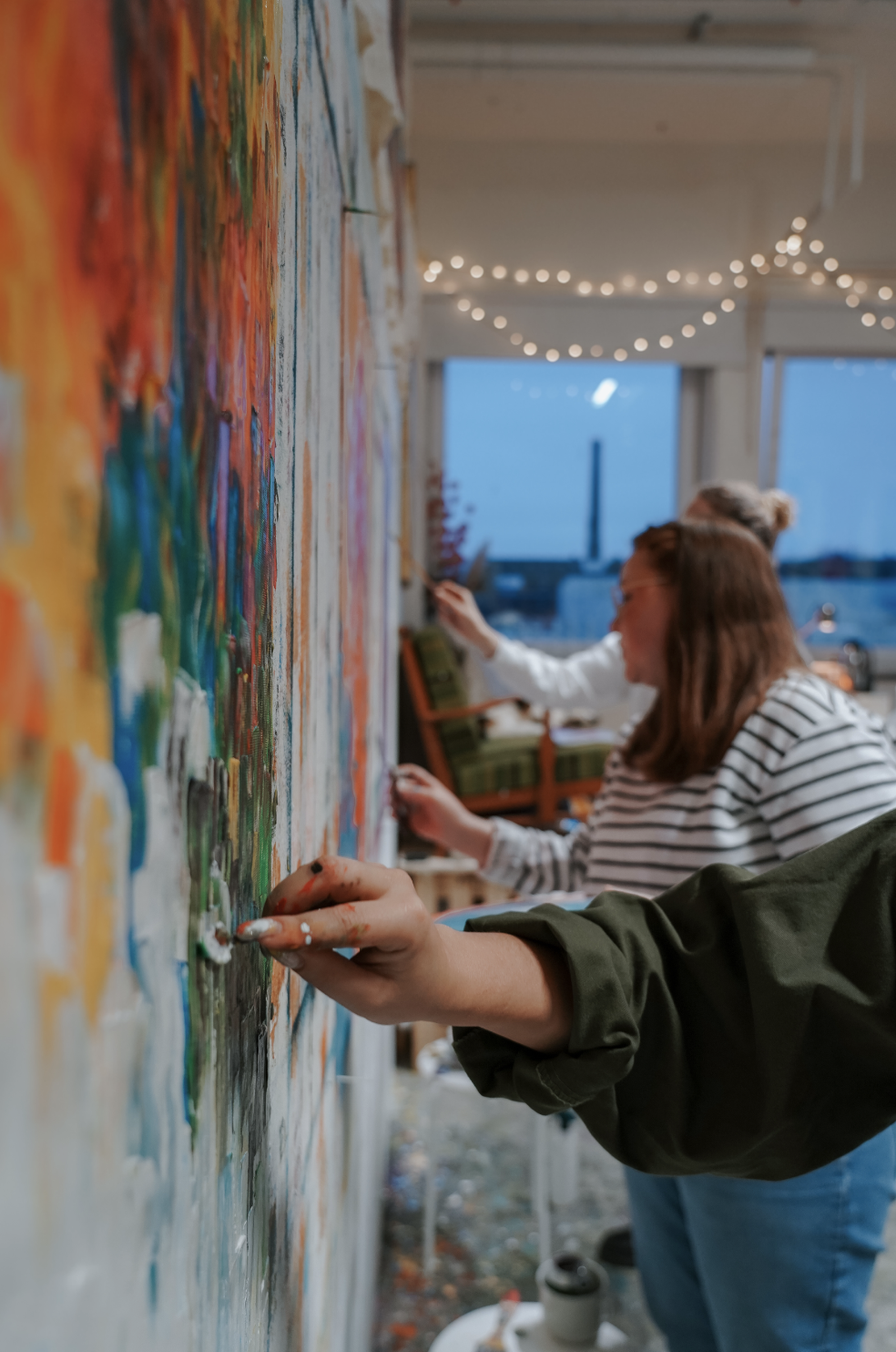 Relaxed, social painting sessions focused on freedom, play, and experimentation on large canvases.